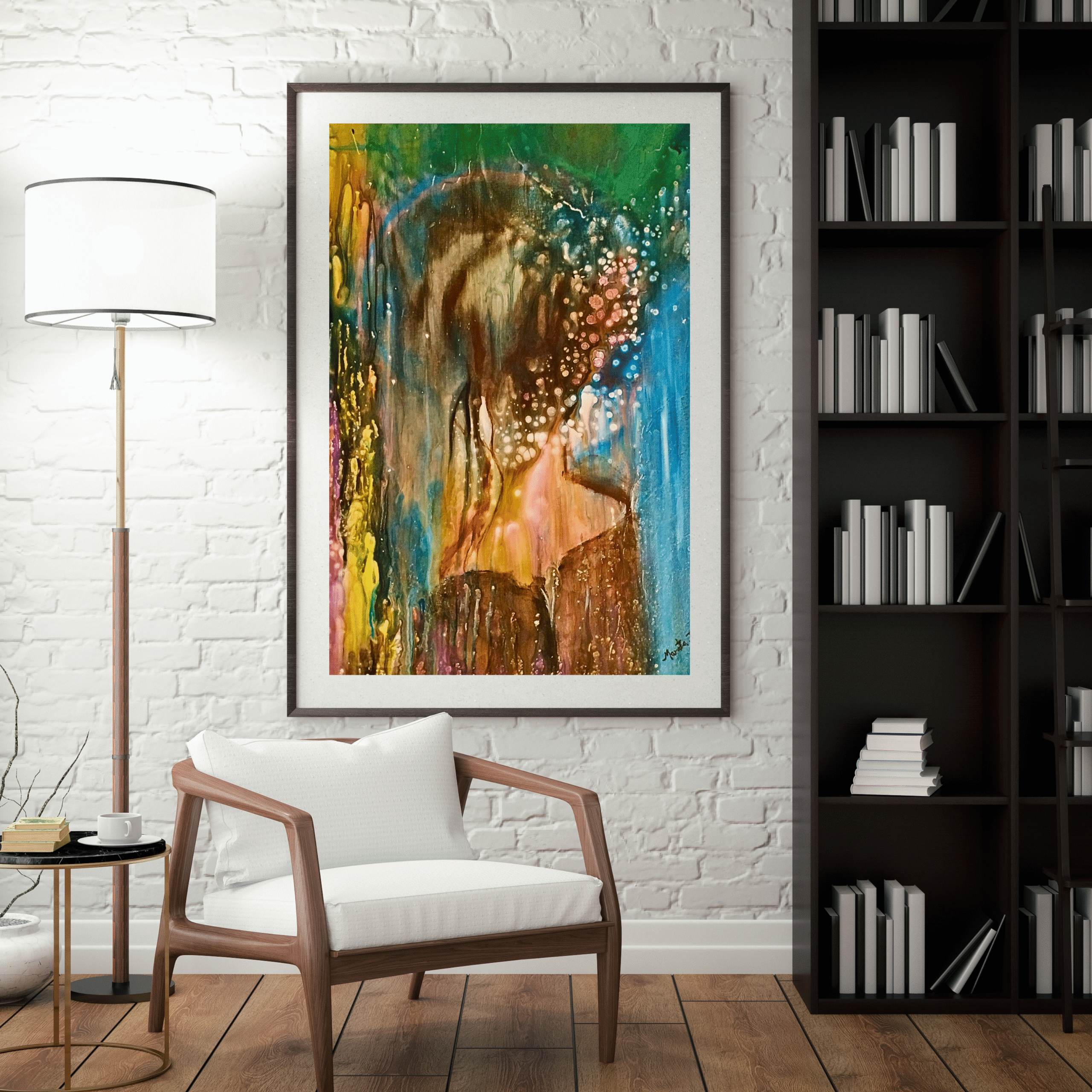 “Dream Girl” captures the silhouette of a feminine figure surrounded by swirling energy and celestial sparkles. The palette, rich in deep purples, radiant golds, and aquatic blues, creates an aura of mystery and reverie. This piece speaks to the dreamer, the believer in beauty beyond the seen — a muse painted in quiet reflection.