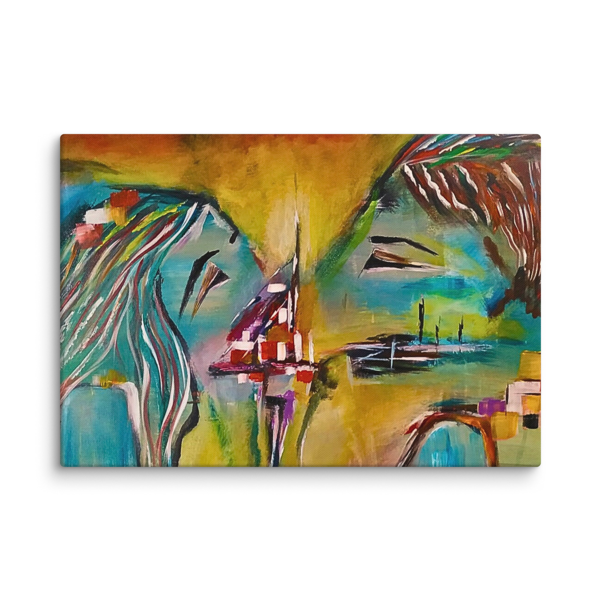 emotional abstract painting, face-to-face canvas, colorful emotion art, symbolic couple artwork, modern relationship