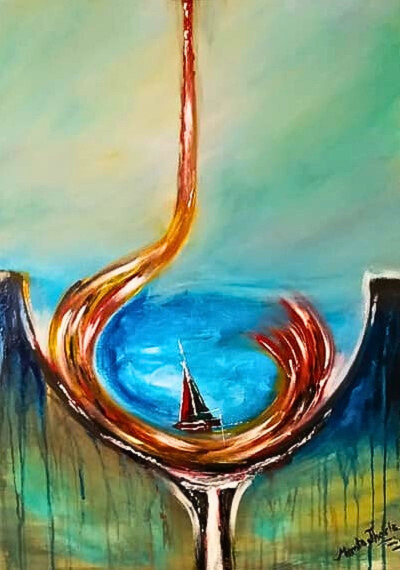 Original abstract ocean acrylic painting with sailboat “Ride the Wave” is a powerful contemporary seascape artwork by Mamta Jharia that captures the spirit of courage, movement, and the emotional rhythm of the ocean.