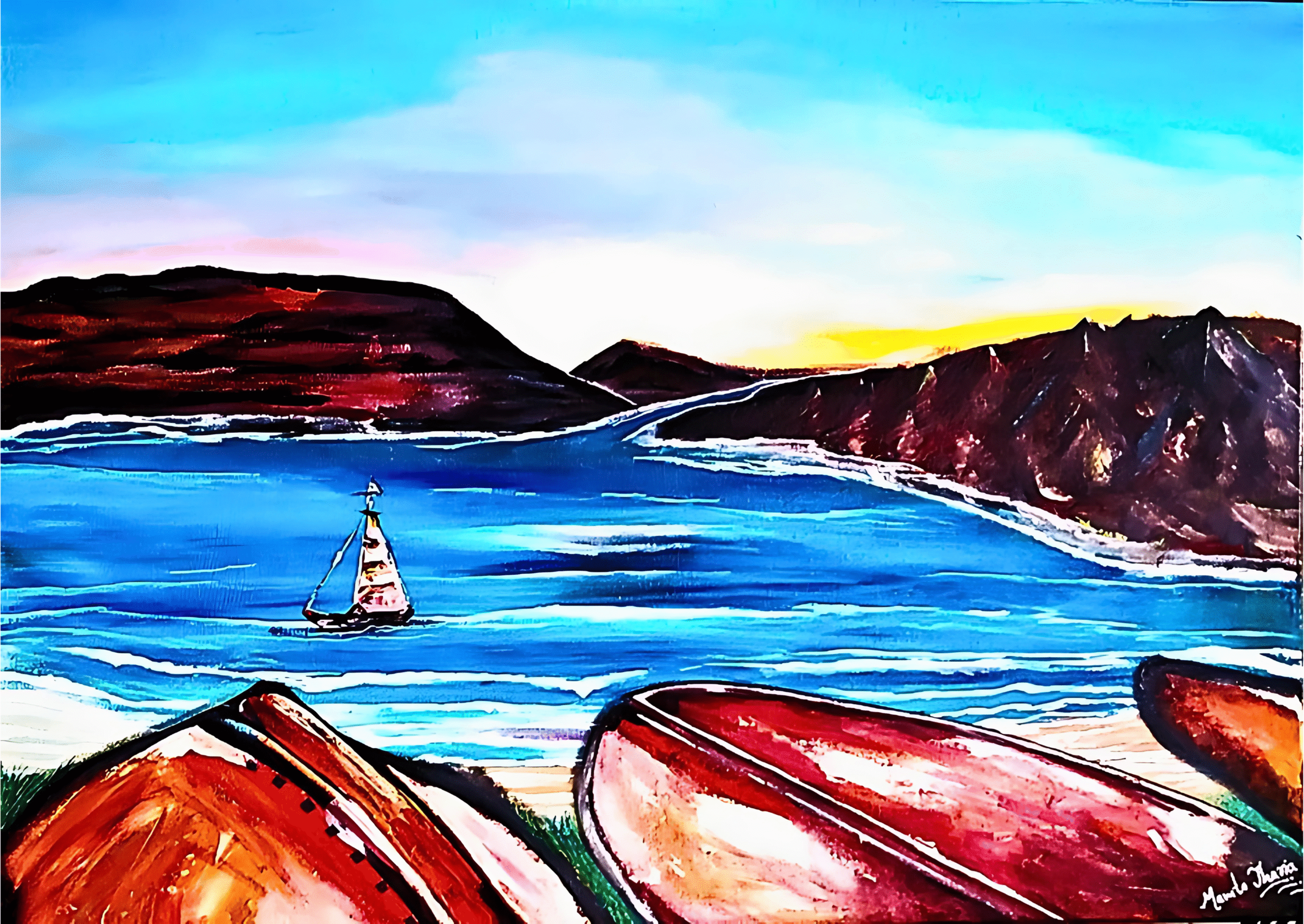 Created by the contemporary artist behind Mamta Jharia Art, the artwork reflects the quiet beauty of coastal landscapes through expressive acrylic brushwork. The painting captures the sensation of standing near the shoreline—feeling the gentle wind, hearing the distant waves, and experiencing the calming power of nature.