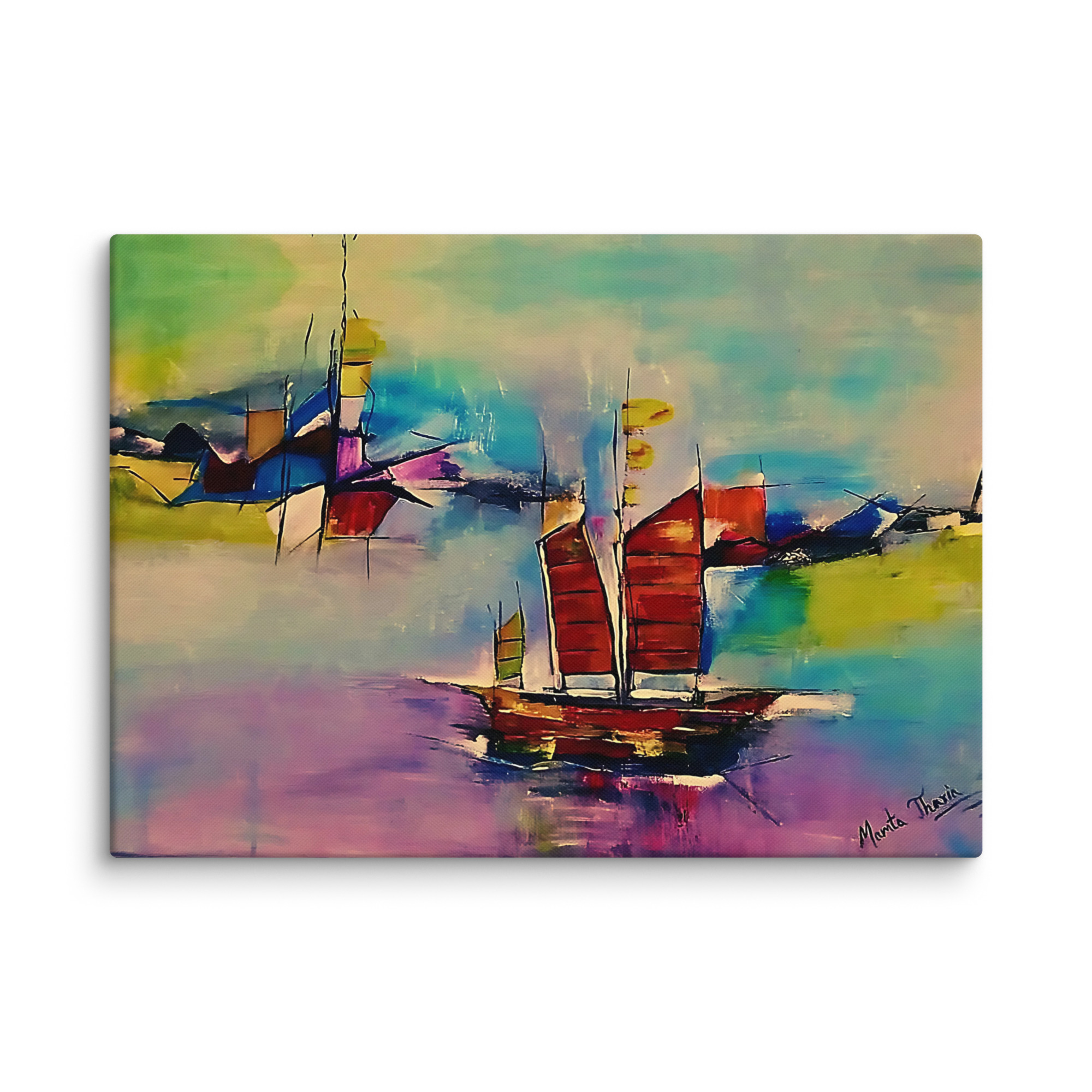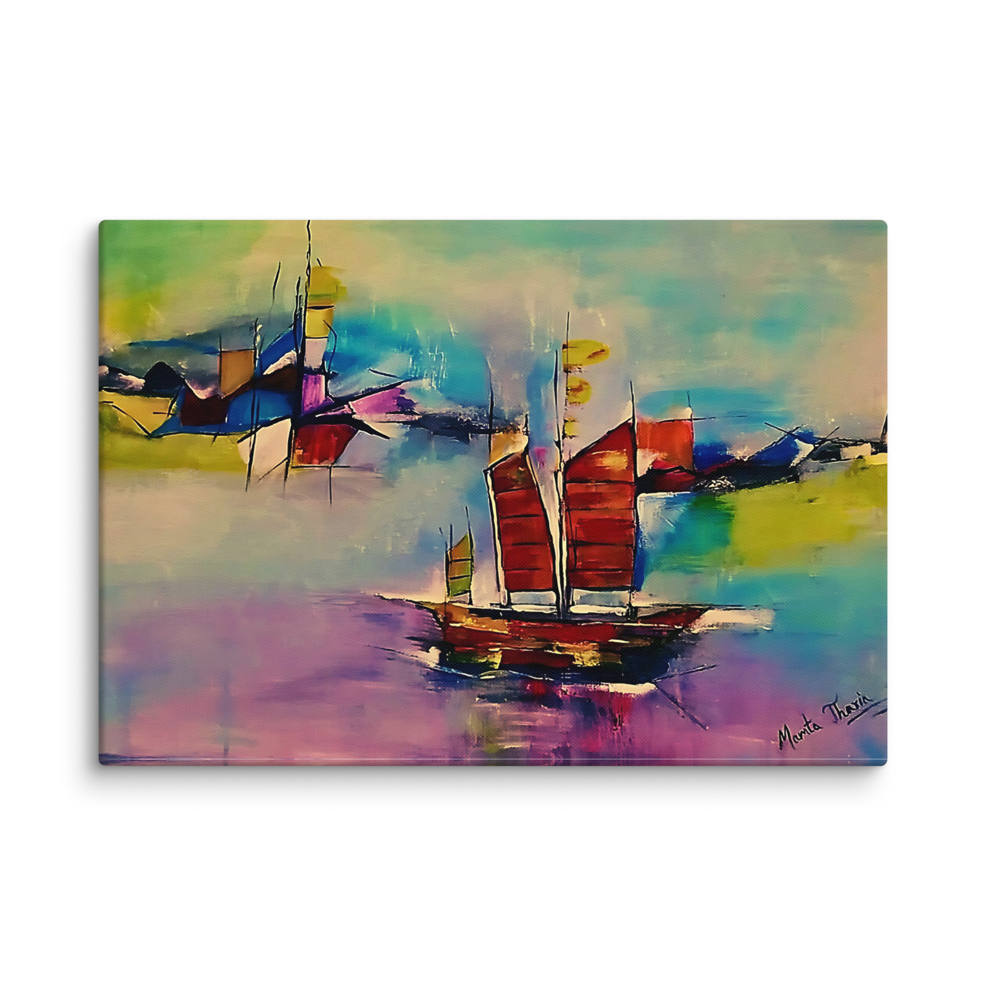 **Keywords**: abstract sailboat print, horizon artwork, ocean journey painting, colorful marine canvas, abstract seascape